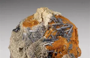 Rutile is oxide group mineral with formula: titanium dioxide (TiO2). It often appears as pale golden, needlelike crystals inside quartz. When not enclosed in quartz, it is usually yellowish or reddish brown, dark brown, or black.