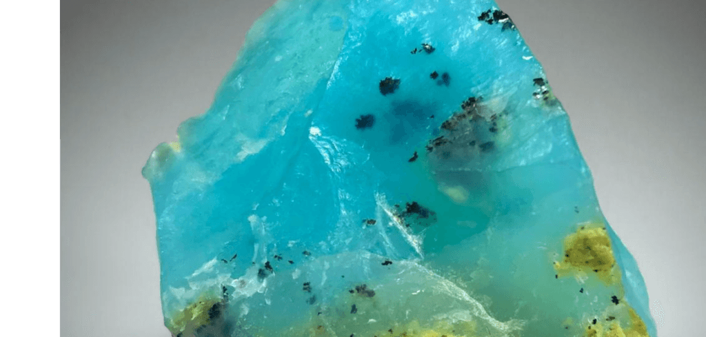 - Transparencia: El ópalo azul andino normalmente muestra distintos grados de transparencia, desde opaco hasta semitranslúcido. Si bien algunos especímenes pueden parecer completamente opacos, otros dejan pasar la luz, creando una cualidad luminosa y etérea.
