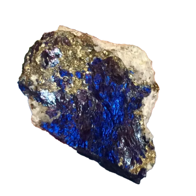 2. Bornita (CU5FES4): Bornita, también conocida como mineral de pavo real Debido a sus colores iridiscentes, es otro mineral de cobre que se asocia comúnmente con la covelita. La bornita se encuentra a menudo junto con la calcopirita y la covelita en depósitos minerales. Se forma en condiciones similares y también puede contribuir a la mineralización general de cobre en un depósito.