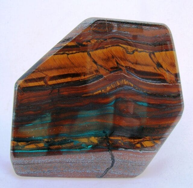 - Composición: Químicamente, el hierro tigre es predominantemente dióxido de silicio (SiO2), debido al contenido de cuarzo tanto en el ojo de tigre como en el jaspe. Las variaciones de color se deben en gran medida a las impurezas del óxido de hierro, que están más concentradas en la hematita y en menor medida en el jaspe.