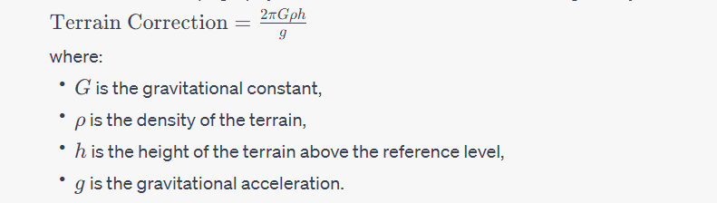 - Método: Calculado utilizando modelos digitales del terreno (DTM) para estimar la atracción gravitacional de la topografía. La fórmula para la corrección del terreno viene dada por: