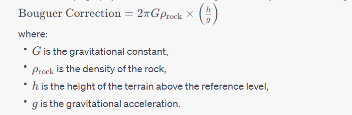 - Corrección: La corrección de Bouguer implica restar la atracción gravitacional del terreno elevado del valor de gravedad observado. Esta corrección generalmente se aplica usando la fórmula de Bouguer: Anomalía de Bouguer = Gravedad observada − Corrección de Bouguer Anomalía de Bouguer = Gravedad observada − Corrección de Bouguer