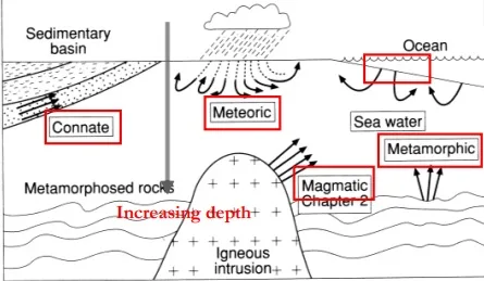 - agua hidrotermal: Esta es agua caliente que se origina en las profundidades de la corteza terrestre, a menudo asociada con depósitos minerales magmáticos e hidrotermales.