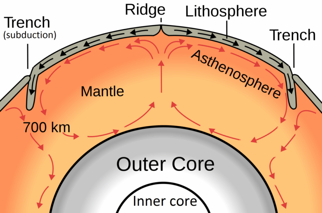 Aunque sólido, el manto se comporta como un fluido muy viscoso a lo largo de extensos periodos de tiempo. Este lento movimiento —conocido como convección del manto — impulsa el movimiento de las placas tectónicas.