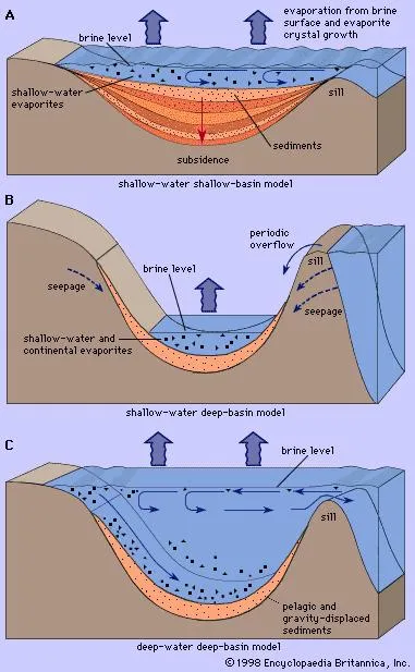 - Algunas evaporitas pueden formarse en cuencas profundas donde la tasa de evaporación es significativa. Estas cuencas pueden incluir grandes masas de agua, como mares o lagos antiguos, donde la concentración de minerales disueltos se produce durante períodos prolongados.
