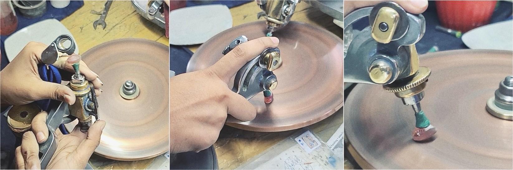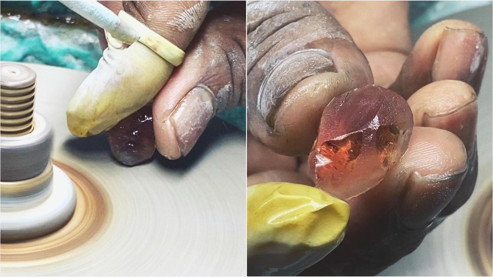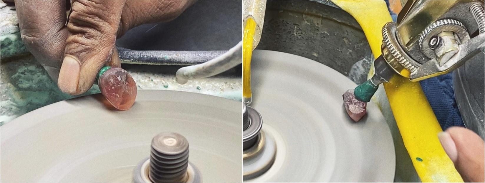 Once pre-shaped, the stones are attached to dop sticks, which are tools that hold the stones securely while they are being worked on. We use wax and adhesive to mount the stone onto the dop stick, allowing our cutters to have precise control during the cutting and polishing stages without the stone loosening and falling during cutting process. This is a crucial step to ensure the accuracy of the final cut.