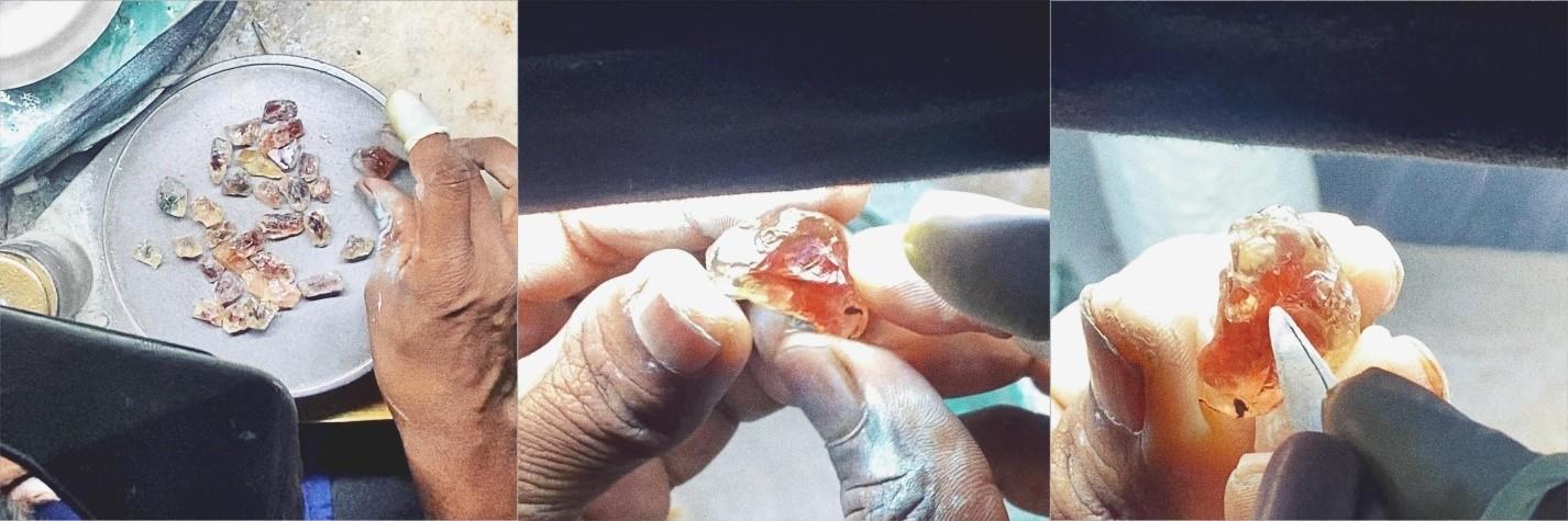 After the stones are evaluated and sliced, we move on to pre-shaping. This step involves forming the rough into a basic shape that is best suited to the stone’s natural structure and internal features. Our cutters take great care in this process, as it helps to conserve material and prepare the stone for the final stages of cutting.