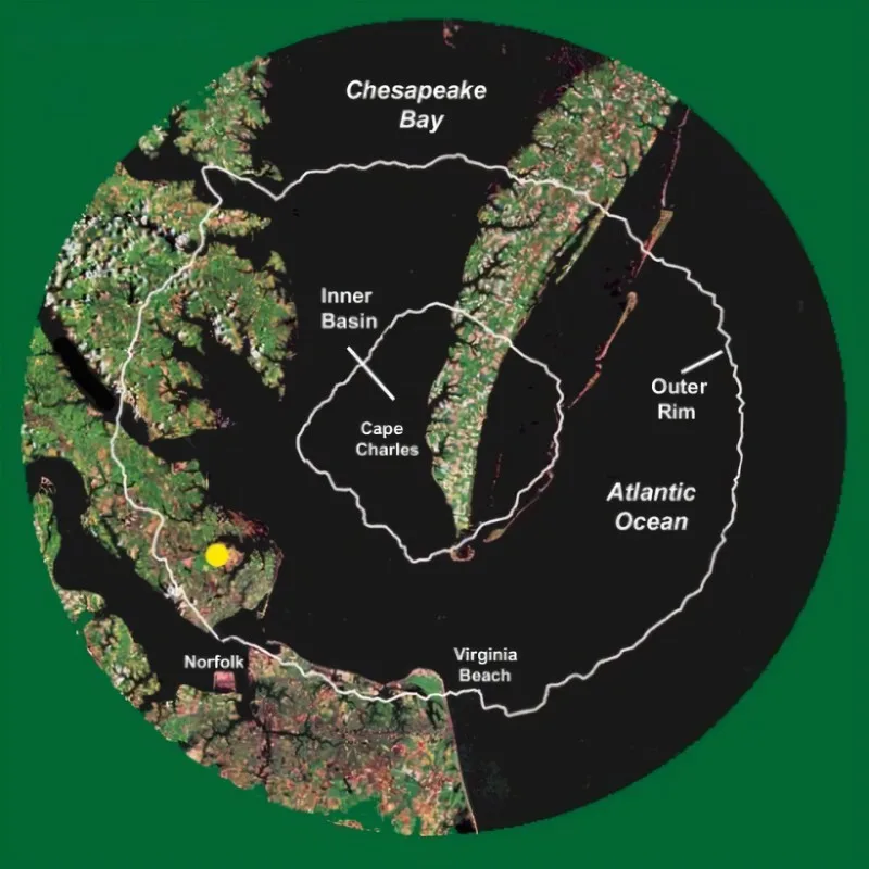 This crater is buried beneath the Chesapeake Bay and the surrounding region on the east coast of the United States. It was formed around 35 million years ago and was discovered in the 1980s.