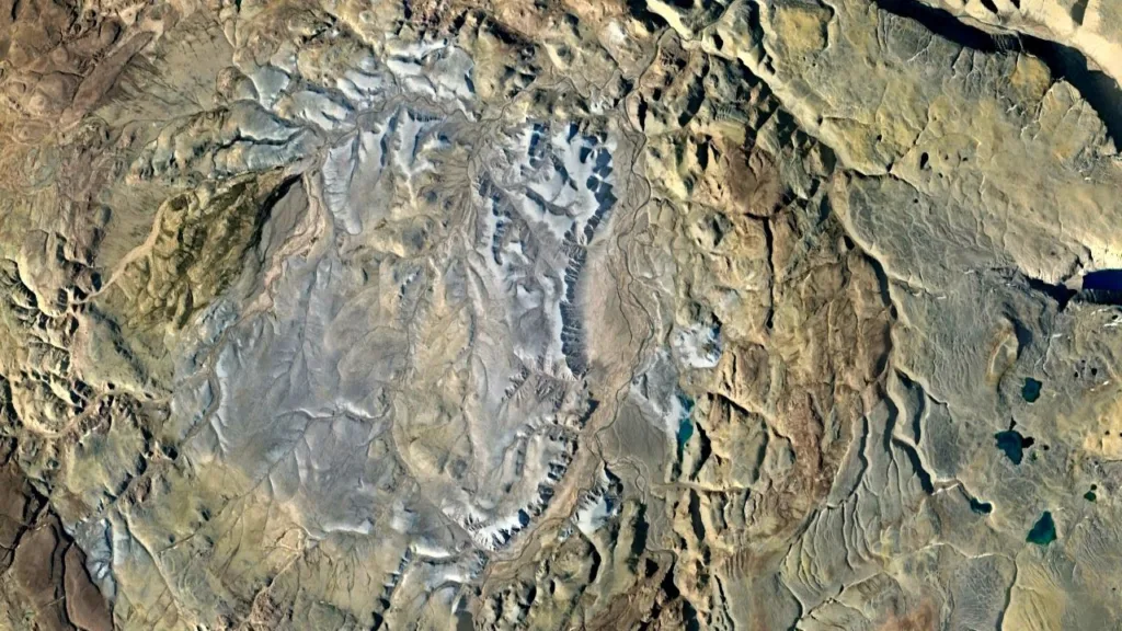 This impact crater is located in the Pamir Mountains in Tajikistan. It was formed about 25 million years ago and is relatively well-preserved.