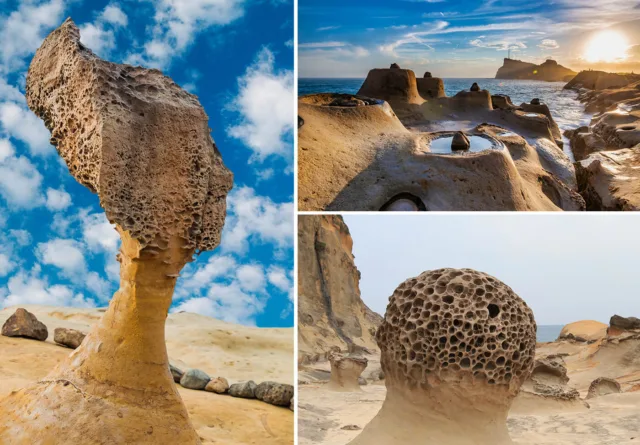 Yehliu Geopark is a coastal geological park located in New Taipei City, Taiwan. It is known for its distinctive rock formations, including the iconic “Queen’s Head,” a rock resembling the profile of a queen. The park features various other fascinating formations shaped by wind and sea erosion.