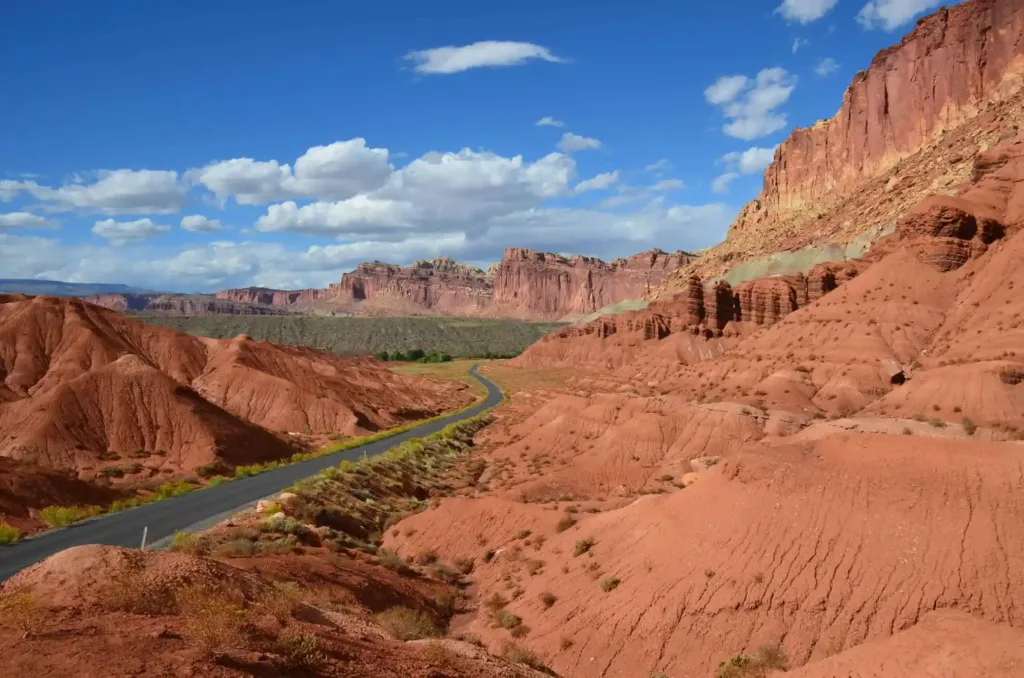 - Fruita is surrounded by the towering red cliffs of Capitol Reef, creating a picturesque setting that combines the lush greenery of the valley with the dramatic desert landscape.