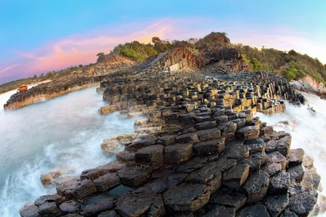 Geographically, the reef is characterized by its distinctive hexagonal basalt columns, formed from ancient volcanic activity. These columns are tightly packed together and create a fascinating natural mosaic that extends from the coastal area into the sea. The interlocking hexagonal shapes make Da Dia Reef a unique geological formation and a stunning sight for visitors. The geological processes that led to the creation of these columns involved the cooling and solidification of lava flows, resulting in the unique hexagonal pattern that has made this location famous.