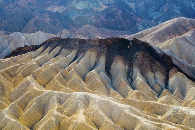 Zabriskie Point offers one of the most iconic vistas in Death Valley. It provides panoramic views of the badlands, which are characterized by eroded and colorful clay hills. The erosional processes have created a unique, labyrinthine landscape.