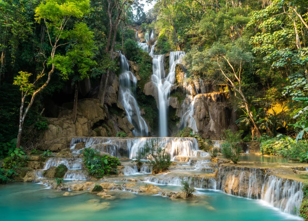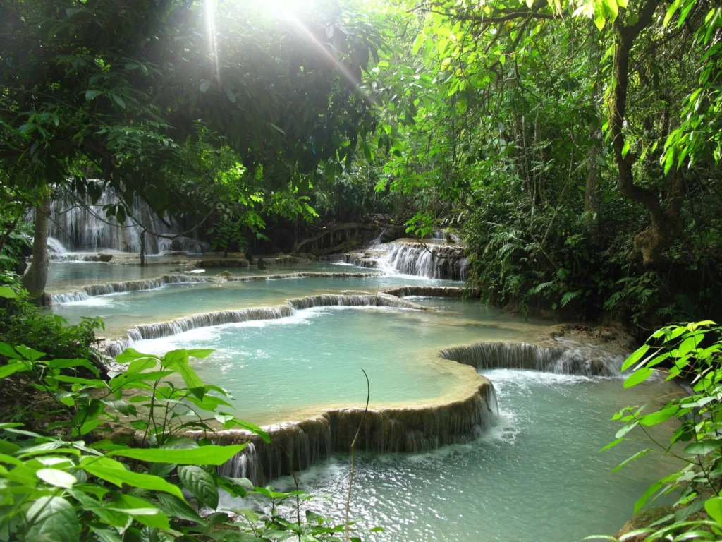 1. Tiered Cascades: Kuang Si Falls is famous for its multi-tiered cascades, with water flowing over numerous limestone terraces. These terraces create a series of beautiful pools and waterfalls, each with its own unique character and charm.