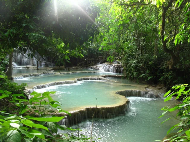 2. Terraced Cascades: The falls consist of a series of terraced limestone formations. Water flows over these terraces, depositing minerals and creating the beautiful turquoise pools and cascades that are a hallmark of Kuang Si Falls.