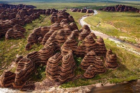 The unique appearance of the Bungle Bungle domes is attributed to the subsequent processes of erosion and weathering. The domes are formed from the erosion of the sandstone layers, which have varying degrees of hardness and resistance to weathering. The more resistant layers create the distinct beehive-shaped formations, while softer layers erode more quickly, creating valleys and gullies between the domes.