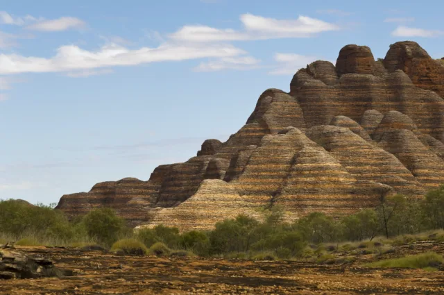 One notable example of sandstone dome structures is the Bungle Bungle Range in Purnululu National Park, as mentioned earlier. The beehive-shaped domes of the Bungle Bungle Range are composed of Devonian-age quartz sandstone and showcase distinctive banding patterns due to the presence of cyanobacteria and different sedimentary layers.