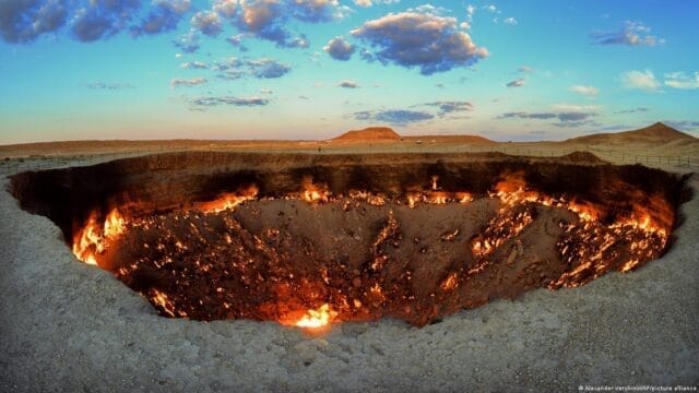 - Natural Gas Crater: The Door to Hell is a large crater that formed as a result of a natural gas drilling accident in 1971. The ground collapsed during drilling, creating a wide crater measuring approximately 70 meters in diameter and 20 meters in depth. The escaping natural gas caught fire, and it has been burning ever since, giving the crater its fiery appearance.