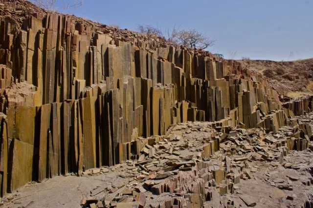 Twyfelfontein Organ Pipes is a unique geological formation and a popular tourist attraction located in the Kunene Region of northwestern Namibia. Twyfelfontein is renowned for its ancient rock engravings and paintings, which have been recognized as a UNESCO World Heritage Site since 2007. However, the “Organ Pipes” refer to a specific rock formation within the Twyfelfontein area.