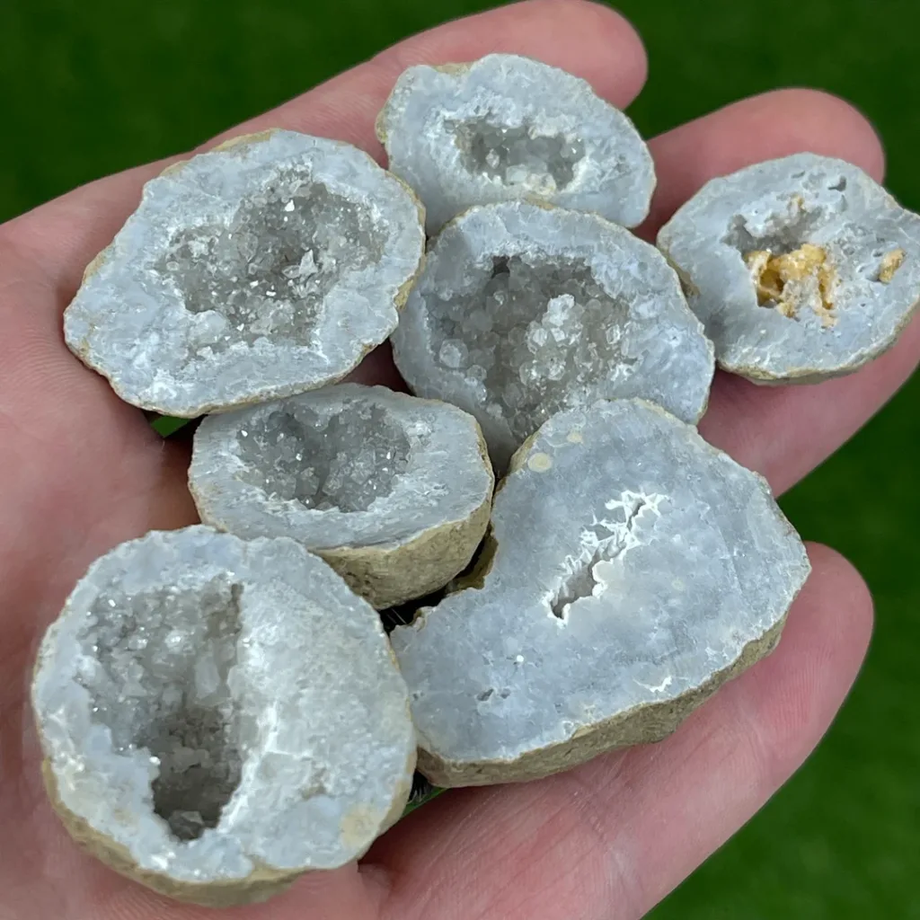 Geodes vary in size—from tiny “thumbnail” geodes a few centimeters wide to massive formations exceeding several feet in diameter. What makes them unique is their hidden beauty: from the outside, they look like plain rocks, but cracking them open reveals a glittering surprise.