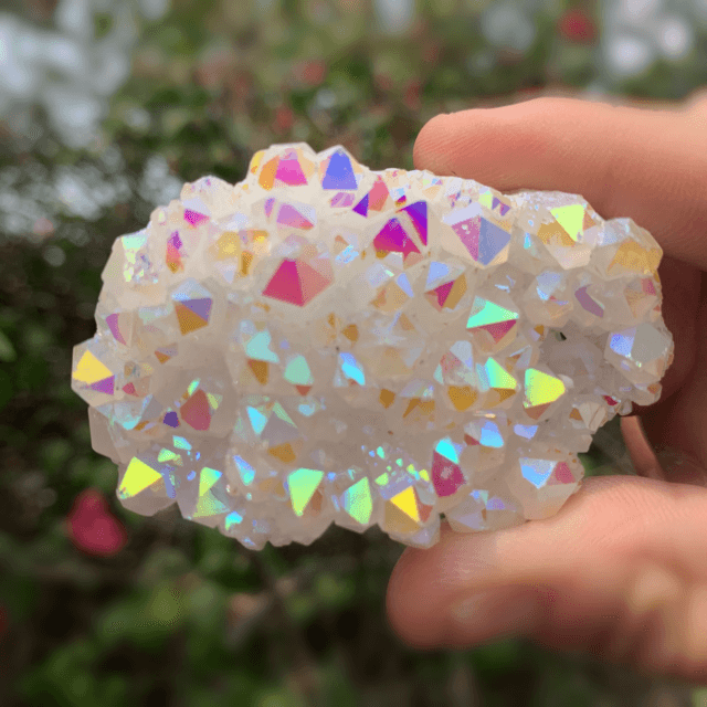 Angel Aura Quartz, also known as Rainbow Aura Quartz, is a stunning crystal that belongs to the quartz family. It’s characterized by its iridescent sheen, which displays a captivating array of colors reminiscent of the rainbow. This ethereal appearance is achieved through a unique treatment process, where clear quartz crystals are bonded with vaporized platinum, silver, and other trace metals at extremely high temperatures.
