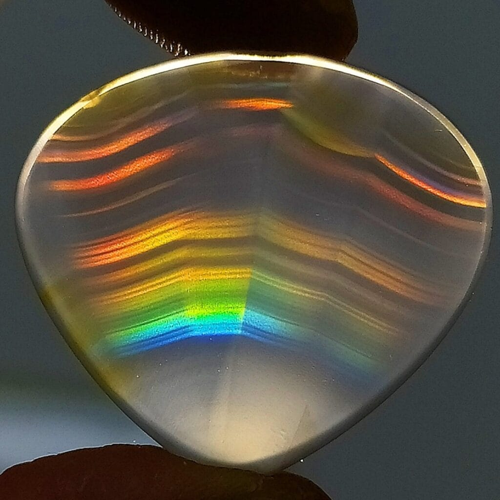 - Color Formation: The vibrant colors and iridescence of Iris Agate are the result of light interacting with the microstructures within the silica layers. As light passes through the thin layers of silica, it undergoes diffraction, splitting into its component wavelengths and creating the spectral colors that give Iris Agate its characteristic shimmering effect.