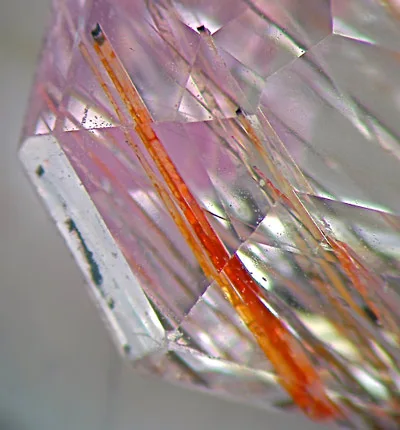 These inclusions can occur in various orientations and patterns depending on the specific conditions during crystal growth. The exact mechanisms behind the formation of rutile inclusions within Kunzite are still a subject of study, but they are believed to result from variations in temperature, pressure, and chemical composition within the pegmatite during the crystallization process.