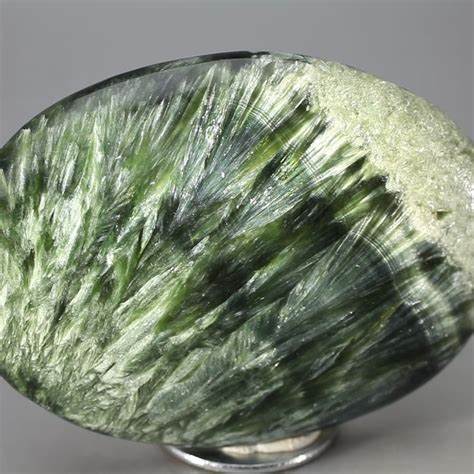 4. Characteristics of Russian Seraphinite: Seraphinite from the Lake Baikal region is often highly sought after due to its remarkable chatoyancy and intricate patterns. The feather-like formations and vibrant green color are distinctive features of Russian seraphinite. The unique patterns are caused by the orientation of fibrous mineral inclusions within the stone.