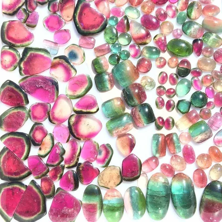 In its raw form, watermelon tourmaline crystals are often long and columnar, making them ideal for cutting into slices or cabochons. Slices of watermelon tourmaline are highly sought after for their ability to display the entire color spectrum within a single cut.