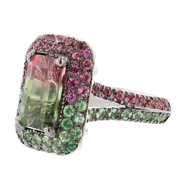 Watermelon tourmaline is most often cut in slices to showcase its stunning color zones. Lapidaries take great care in selecting the best angles and cuts to emphasize the natural gradient from pink to green. The most prized stones exhibit a sharp contrast between the colors with minimal blending. However, faceting the stone to preserve this balance can be challenging, as inclusions and natural fractures are common in tourmaline crystals.