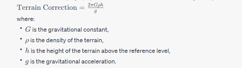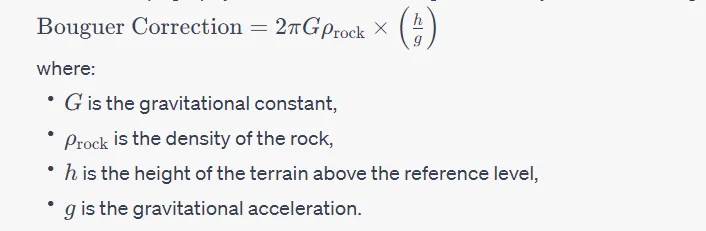 • Correction: The Bouguer correction involves subtracting the gravitational attraction of the elevated terrain from the observed gravity value. This correction is typically applied using the Bouguer formula: Bouguer Anomaly=Observed Gravity−Bouguer CorrectionBouguer Anomaly=Observed Gravity−Bouguer Correction