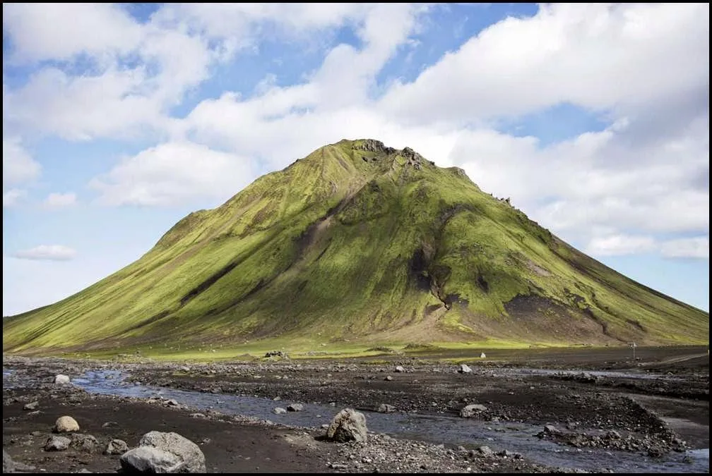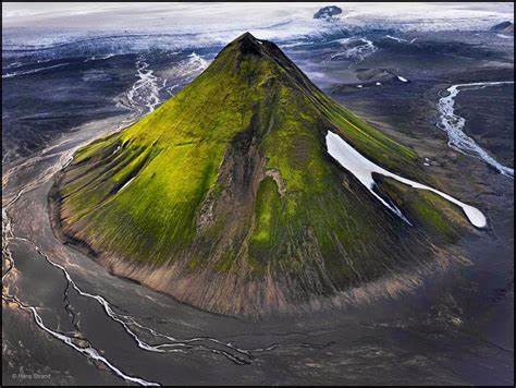 - Cone Shape: Maelifell has a well-defined cone shape, with steep and symmetrical sides. The cone is composed of layers of volcanic ash and basaltic lava flows, giving it a textured appearance.