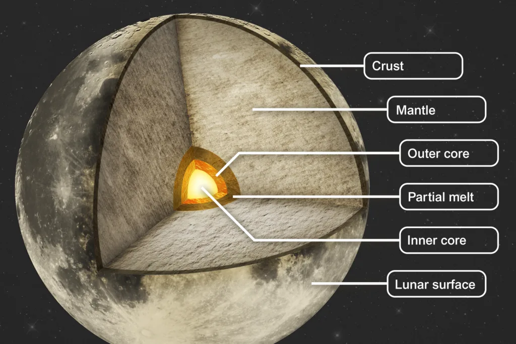 - Unlike Earth, the Moon does not have a large, liquid outer core. Instead, any metallic core is thought to be small and partially solidified, primarily composed of iron and nickel.