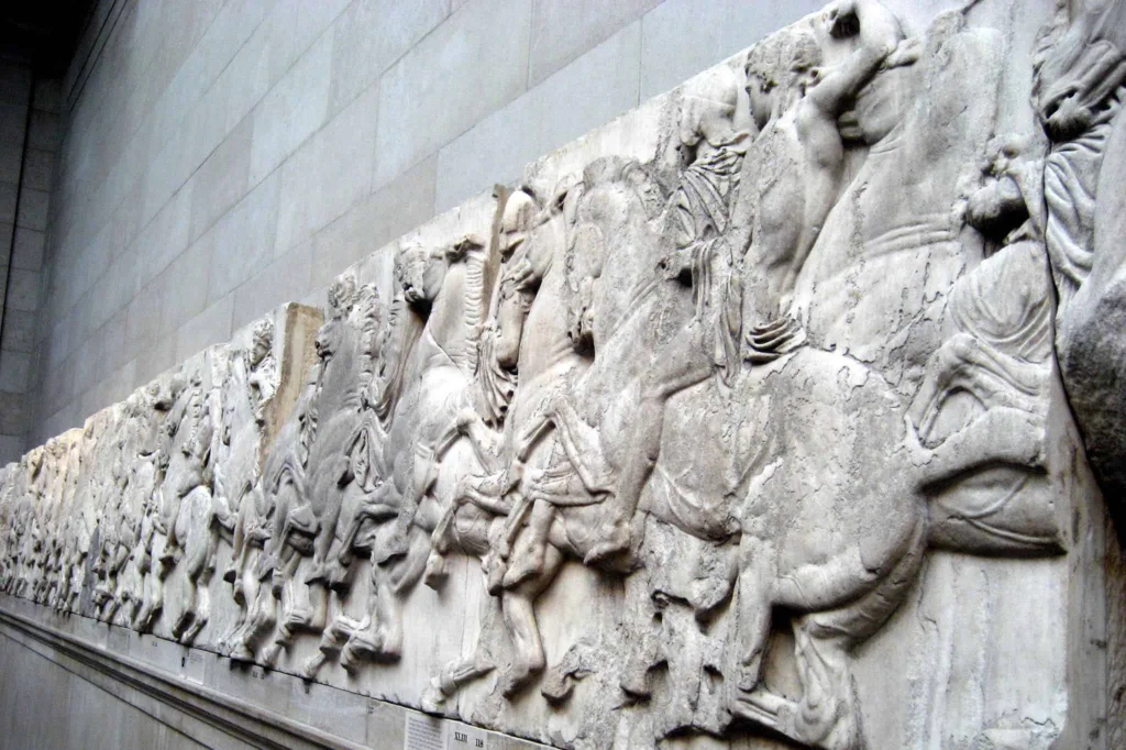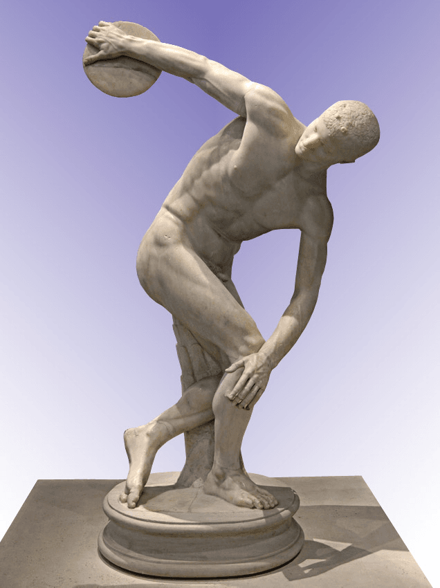 “Discobolus”: Also known as the “Discus Thrower,” this ancient Greek marble sculpture from the 5th century BCE represents an athlete preparing to throw a discus. Created by the sculptor Myron, the sculpture exemplifies the idealized human form and athletic prowess of ancient Greek art. Several Roman marble copies of the original Greek bronze sculpture exist, including one displayed at the British Museum in London, UK.