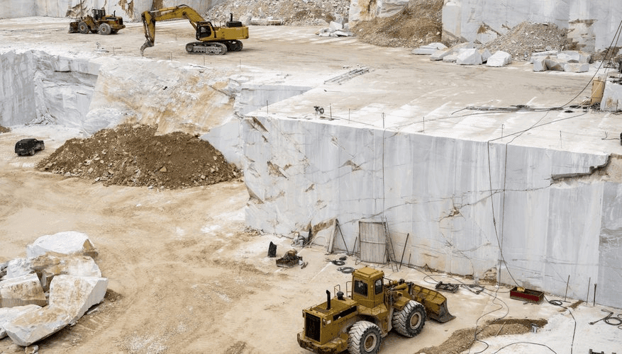 - Open-Pit Mining: In open-pit mining, large pits or quarries are excavated on the surface to access marble deposits. Heavy machinery, such as bulldozers and excavators, is used to remove overburden (soil, rock, and vegetation) to expose the marble bedrock. Once exposed, blocks of marble are extracted using wire saws, diamond-tipped chainsaws, or drilling and blasting techniques.