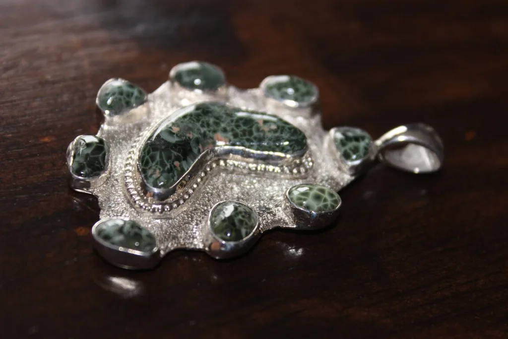 - Jewelry: Chlorastrolite is often used in the creation of jewelry, including necklaces, pendants, earrings, rings, and bracelets. Its distinctive green color and starburst pattern make it an eye-catching and unique gemstone. Jewelry designers and collectors appreciate its rarity and visual appeal, and it is sometimes used as a centerpiece stone in custom pieces.
