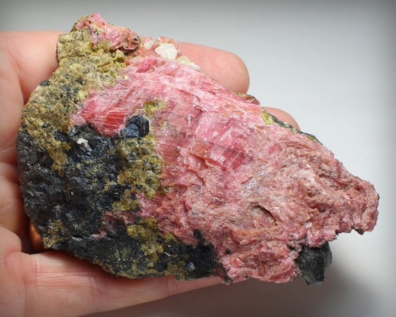- Composition and Formation: Rhodonite is a manganese silicate mineral that forms in metamorphic environments, often in association with other manganese-bearing minerals.