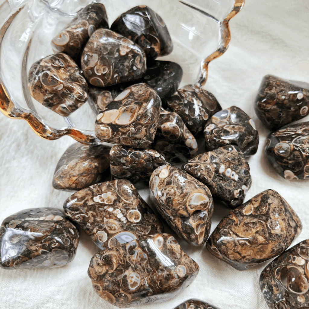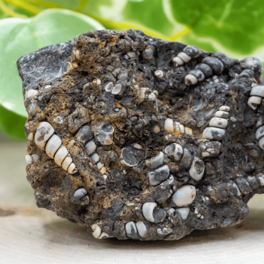 - Color Contrasts: Turritella Agate typically displays a combination of translucent or opaque agate layers with dark brown or black fossilized snail shells. This stark contrast between the light-colored agate and the dark fossil inclusions enhances the visual impact of the stone, making it easily recognizable and highly sought after.