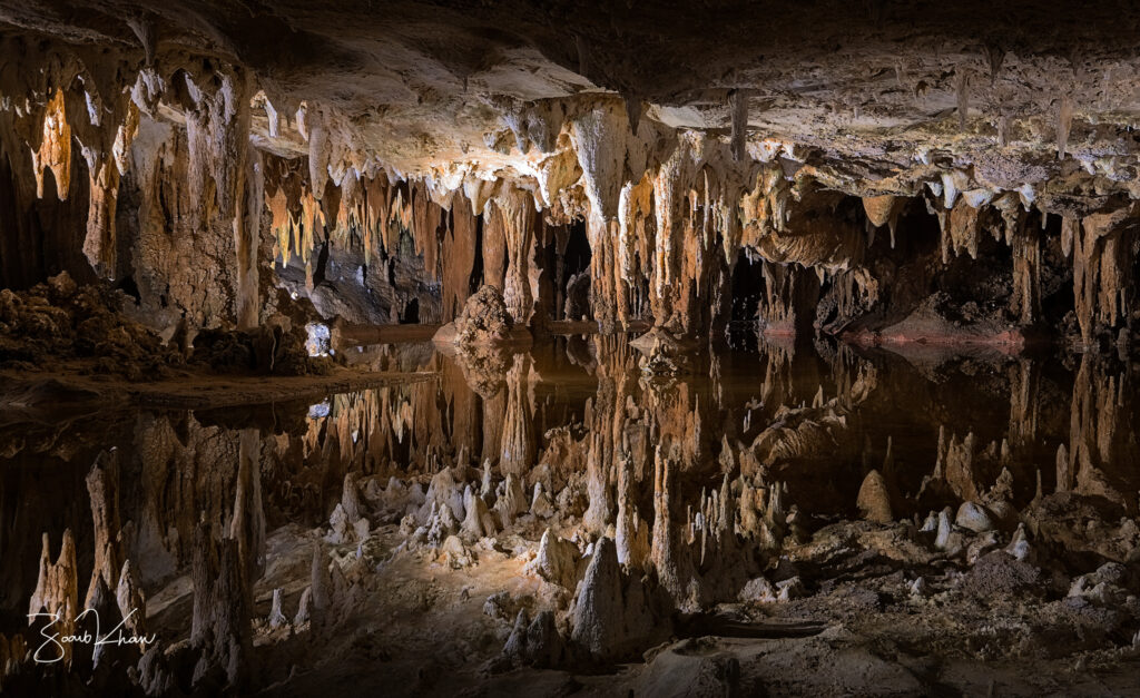Quando se fala em cavernas, geralmente vêm à mente estalactites e estalagmites. As colunas de calcita são diferentes. A água não goteja. Ela flui como uma fina camada ao longo da parede da caverna.