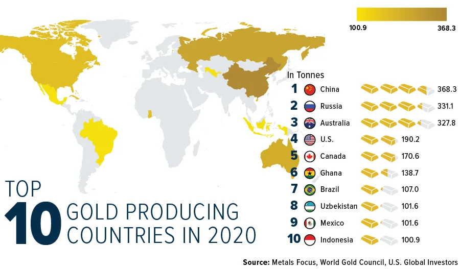 A produção de ouro é dominada por um número limitado de países em escala global.