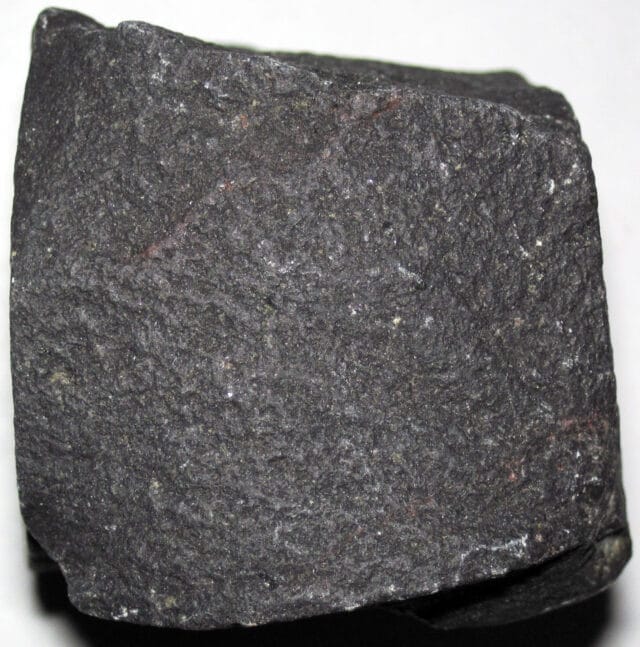Fresh basalt appears dark gray to black, but weathers to brown or reddish tones as iron minerals oxidize.