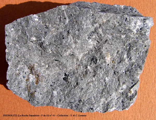 - Feldspar: Phonolite typically contains alkali feldspar as a major mineral component. This is often observed in the form of sanidine or anorthoclase.
